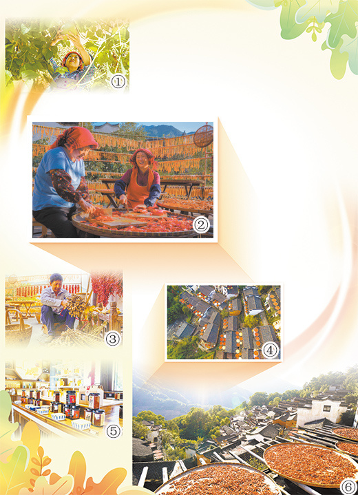 如果说大自然的秋色是一抹灿烂的金黄,那么这里的秋色便是金黄里缤纷的点缀。这点缀就盛放在江西省婺源县篁岭村农家圆圆的晒匾里。