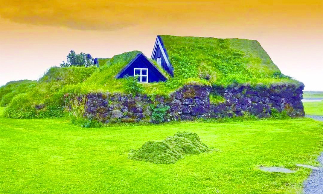 冰岛的草皮屋,代表着当地人因地制宜、与自然和谐共处的智慧。草皮屋的历史最早可以追溯到公元9世纪,维京人来到这里定居的时候。来自斯堪的纳维亚半岛的维京人,习惯用巨大的木头建造长屋,长屋适合多个家庭居住在一起,多数活动都在屋内进行,便于抵御风寒,也便于抵御野兽和敌人的入侵。但初来乍到的维京人发现冰岛遍地都是火山岩和苔原,当地木材奇缺,树木生长也十分缓慢,能用的多是灌木,以及少量从大陆运来的进口木材或从海上漂来的西伯利亚树木。缺少木材,盖房子和取暖都困难,一到冬天冻死人是常有的事。特别是遇到飓风和暴雪,好不容易盖起来的房子很容易倒塌。一旦地震,更是会造成严重伤害。但地上的草皮,再大的风也刮不走。因此,耐用性强、可再生、易广泛普及的草皮就成为主要建材。草皮建造的长屋开始成为冰岛房屋的主流。