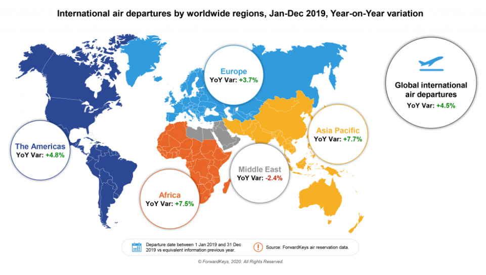 【环球网文旅报道】据ForwardKeys data近日公布的最新数据显示,2019年国际航班预定量同比增长4.5%(以旅客人数衡量),其同比增速下降约6.0%。另外,2019年国际航班预定量增速相比过去十年(平均每年6.8%)趋势放缓。虽然整体增长水平下降,不过未来三个月的预定量或许会有曙光显现。截至目前,2020年1月1日之前的国际航班预订量同比增长8.3%。