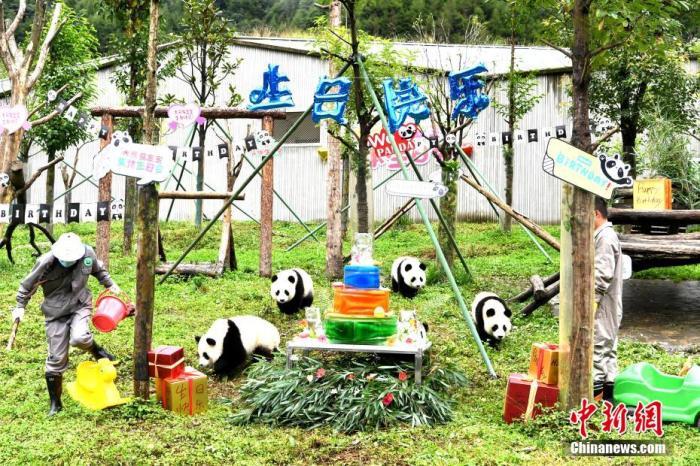 中新社四川卧龙9月16日电 (岳依桐)16日,中国大熊猫保护研究中心卧龙神树坪基地分外热闹,印有生日祝福的装饰横幅、摆满了果蔬的三层三色冰蛋糕、玩具以及礼物盒子将大熊猫幼儿园装饰一新。众多“猫粉”齐聚现场,为2019级大熊猫“天团”庆生。