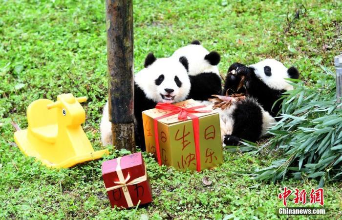 只见一只大熊猫宝宝直接冲向礼物盒子,爪子、牙齿并用将其拆开,随后将头探进去,模样十分可爱;另一只大熊猫宝宝则迫不及待地开始品尝蛋糕,它撑着小桌子站起来,将蛋糕上的水果、蔬菜送入口中;还有的大熊猫宝宝拿起竹笋大快朵颐,撕掉的笋壳铺满肚皮……从中国各地来此的“猫粉”们一边用相机记录下大熊猫“天团”的一举一动,一边直呼可爱。