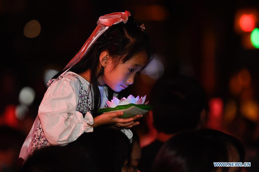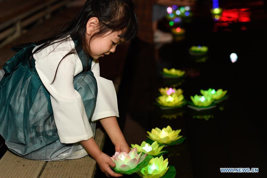A kid releases a water lantern at a scenic spot in Hangzhou City, east China's Zhejiang Province, Sept. 26, 2020. A lantern-themed event kicked off at the scenic spot, with various lantern related activities and performances unveiled to tourists. (Xinhua/Huang Zongzhi)