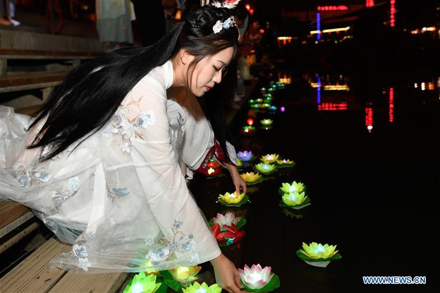 A girl releases a water lantern at a scenic spot in Hangzhou City, east China's Zhejiang Province, Sept. 26, 2020. A lantern-themed event kicked off at the scenic spot, with various lantern related activities and performances unveiled to tourists. (Xinhua/Huang Zongzhi)