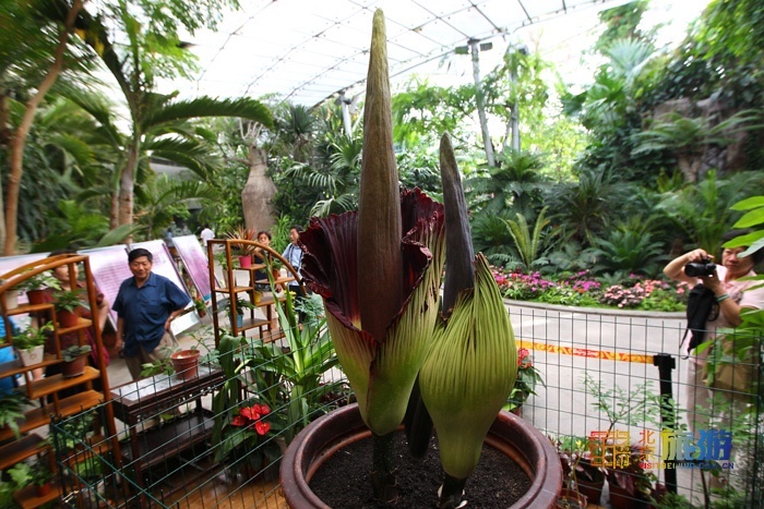 千岁兰原产于安哥拉沙漠,珍稀濒危植物,一生只有两片叶子,能活上千年,所以被誉为“千岁兰”;海椰子是塞舌尔的国宝,是世界上最大的种子,一颗种子可以重达50斤;巨魔芋被誉为世界上花絮最大的植物,在北京植物园已经引种将近10年,花极其难开,在中国第一次开花就是在北京植物园,当时新闻联播还进行了报道。