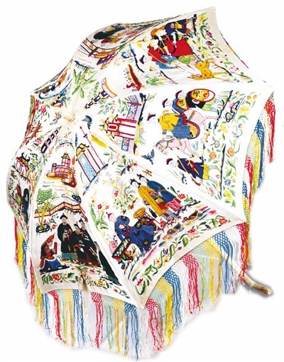 “这把伞可以说是清代广绣技艺的集大成者。”中国丝绸博物馆陈列保管部研究馆员金琳告诉记者,广绣色彩对比度较强,从其伞面以蓝、黄、红等饱和色彩为主色调,且绣面布局繁而不乱来看,这把绸伞应是从广州出口欧洲的广绣作品。