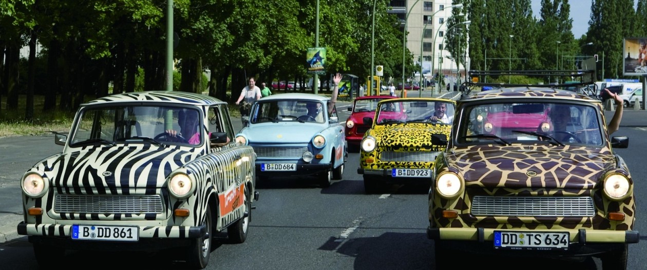 笔者经常在街头看到花花绿绿的“特拉比”小汽车,这是在柏林很受欢迎的名为“特拉比车队”的城市旅游项目。在出发地点“特拉比世界”停着近百辆改装过的不同颜色和图案的汽车,游客可以任选一辆自己喜欢的,跟随导航员自驾或作为乘客游览,途经柏林墙、勃兰登堡门、菩提树下大街、柏林大教堂、红色市政厅、柏林电视塔、查理检查站等东德地标景点。