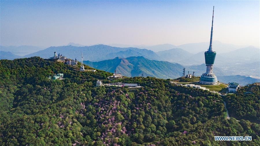 Aerial photo taken on March 21, 2018 shows azalea flowers blooming on Wutong Mountain in Luohu District of Shenzhen, south China's Guangdong Province. Known as a paragon of opening-up and development, Shenzhen in Guangdong Province is one of China's earliest special economic zones. Starting from a small town, it has developed into a key economic hub in the past 40 years. (Xinhua/Mao Siqian)