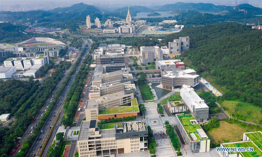 Aerial photo taken on Sept. 5, 2020 shows Chinese University of Hong Kong (Shenzhen)(down) and the Shenzhen MSU-BIT University (up) in Longgang District of Shenzhen, south China's Guangdong Province. Known as a paragon of opening-up and development, Shenzhen in Guangdong Province is one of China's earliest special economic zones. Starting from a small town, it has developed into a key economic hub in the past 40 years. (Xinhua/Mao Siqian)