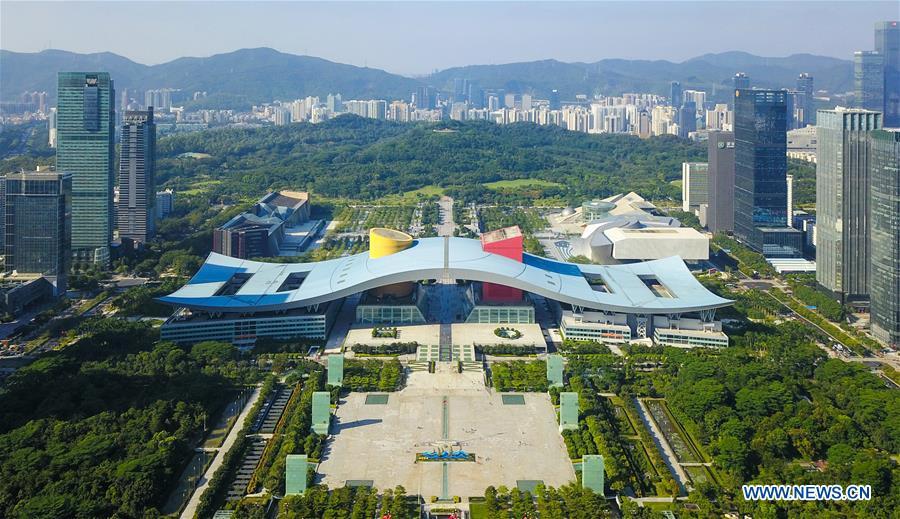 Aerial photo taken on Oct. 2, 2020 shows the citizen center and Lianhua Mountain park in Shenzhen, south China's Guangdong Province. Known as a paragon of opening-up and development, Shenzhen in Guangdong Province is one of China's earliest special economic zones. Starting from a small town, it has developed into a key economic hub in the past 40 years. (Xinhua/Liang Xu)