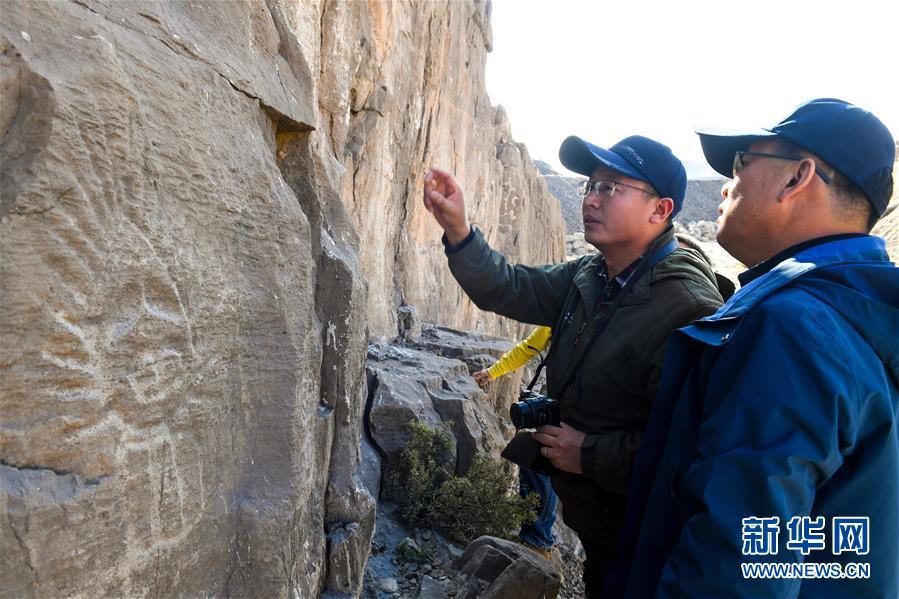 10月18日,考古人员在桌子山岩画群中的召烧沟岩画前进行研讨。 在内蒙古自治区的桌子山,诸多悬崖峭壁和石灰岩磐石上残存着古代岩画的遗迹。这些岩画的内容多为形态各异的人面像、动物图形、狩猎图和符号等,为研究我国古代游牧民族的起源及历史文化提供了重要的实物资料。2013年,桌子山岩画群被国务院公布为第七批全国重点文物保护单位。 新华社记者 彭源 摄