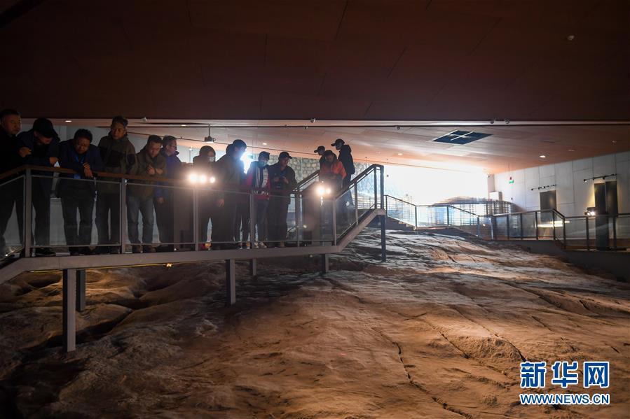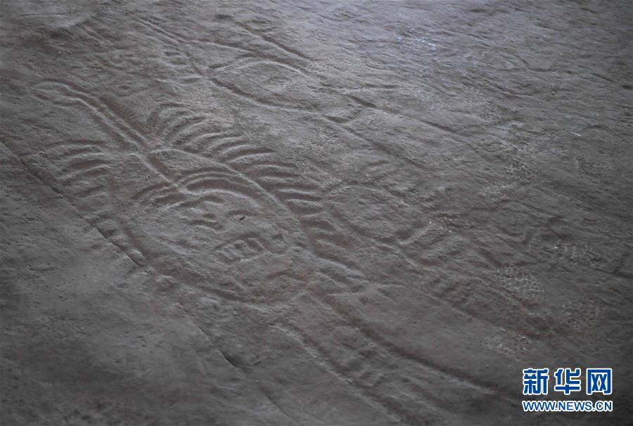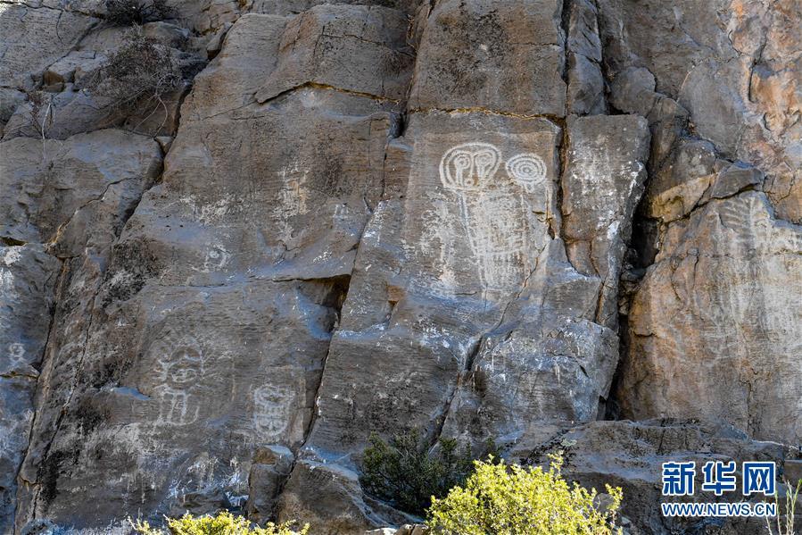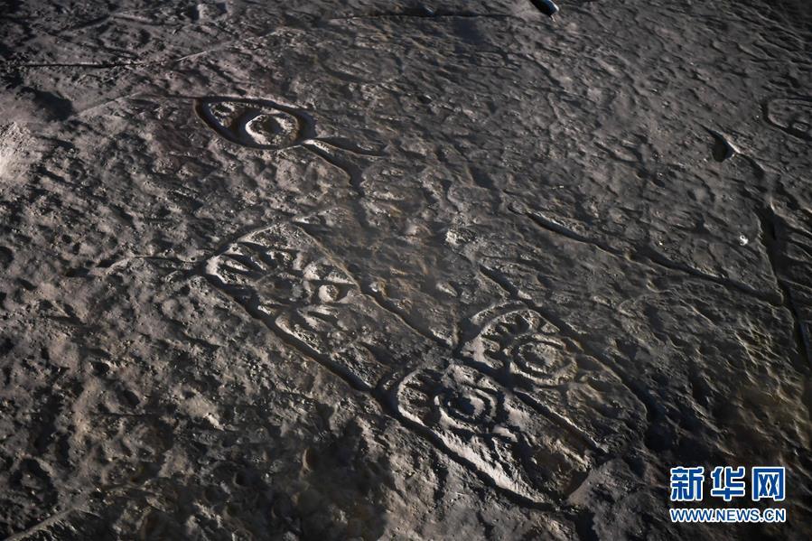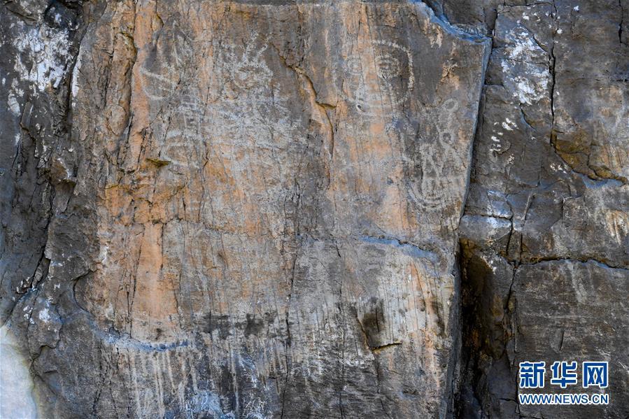 这是10月18日拍摄的桌子山岩画群中的召烧沟岩画局部。 在内蒙古自治区的桌子山,诸多悬崖峭壁和石灰岩磐石上残存着古代岩画的遗迹。这些岩画的内容多为形态各异的人面像、动物图形、狩猎图和符号等,为研究我国古代游牧民族的起源及历史文化提供了重要的实物资料。2013年,桌子山岩画群被国务院公布为第七批全国重点文物保护单位。 新华社记者 彭源 摄