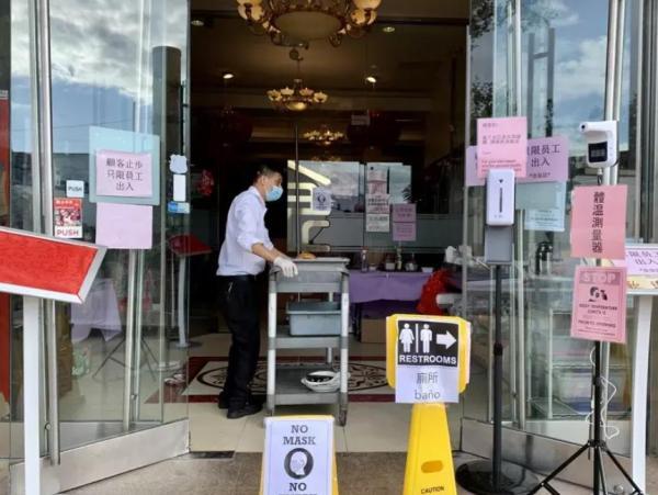 华人聚居的纽约市法拉盛“金皇庭”大酒楼早就备妥要给顾客填写的问卷,门前竖起体温测量仪、摆放好干洗手液和消毒剂,划分不同的入口、出口、点餐区、取餐区,并贴上了醒目的箭头和文字提醒,以减少交叉感染的风险。餐桌全部拉开、保持社交距离,之前可以容纳600人的大厅现在缩减到150人,且为了控制人流,原本配有十张椅子的大餐桌,均已将椅子减少到八张甚至更少。