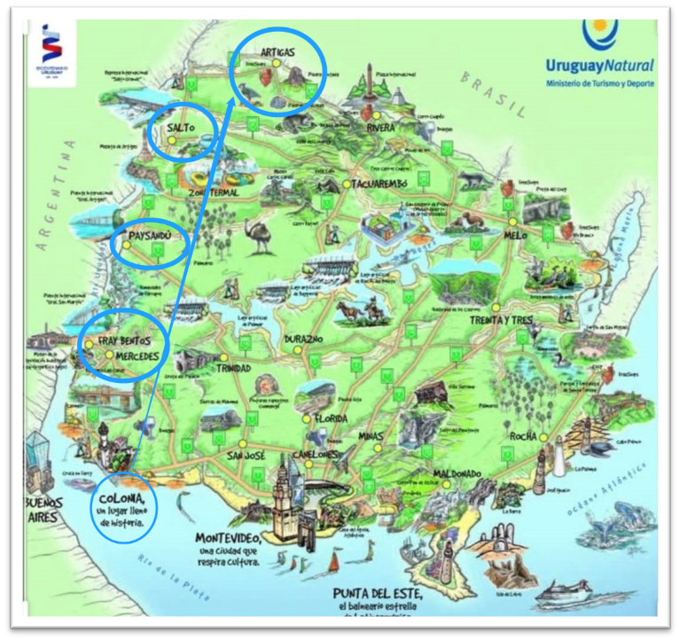 在索里亚诺省、内格罗省、派桑杜省、萨尔托省和阿尔蒂加斯省,“彩鸟河”旅游路线途经景点,是为了看到乌拉圭河及其支流的所有美景 :风景、村庄、风味、自然、历史、水上运动、节日和温泉。