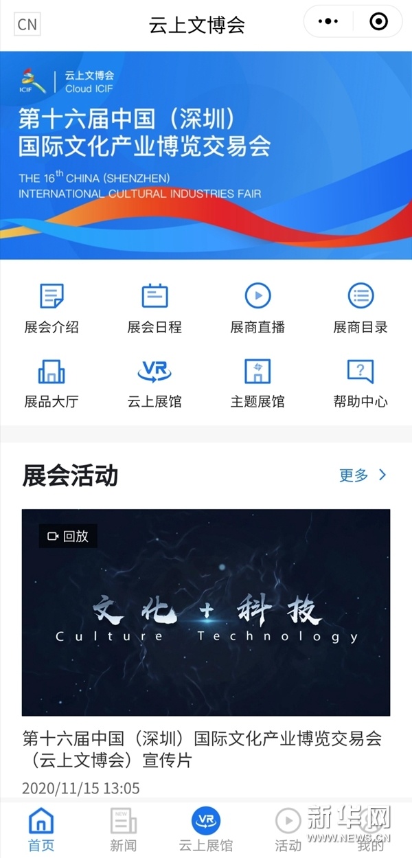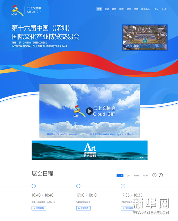新华网北京11月16日电 第十六届中国(深圳)国际文化产业博览交易会(以下简称文博会)于11月16日16:00正式上线。这是首次借助5G、视频直播、VR等新技术,以“云上文博会”的形式与观众见面。