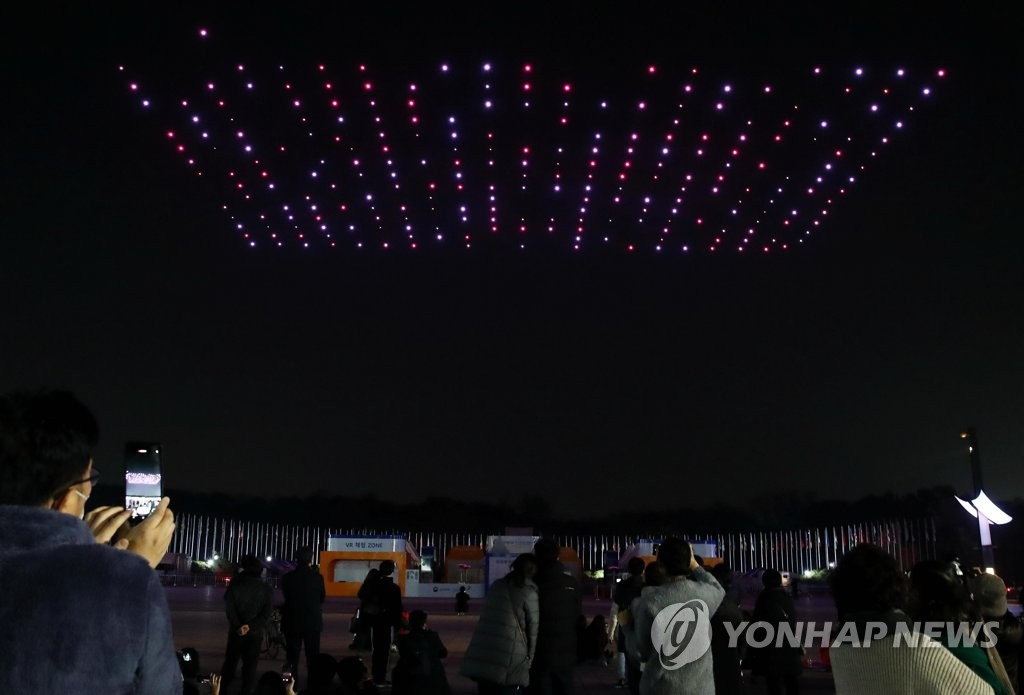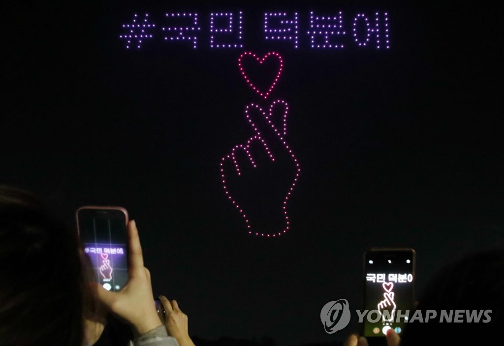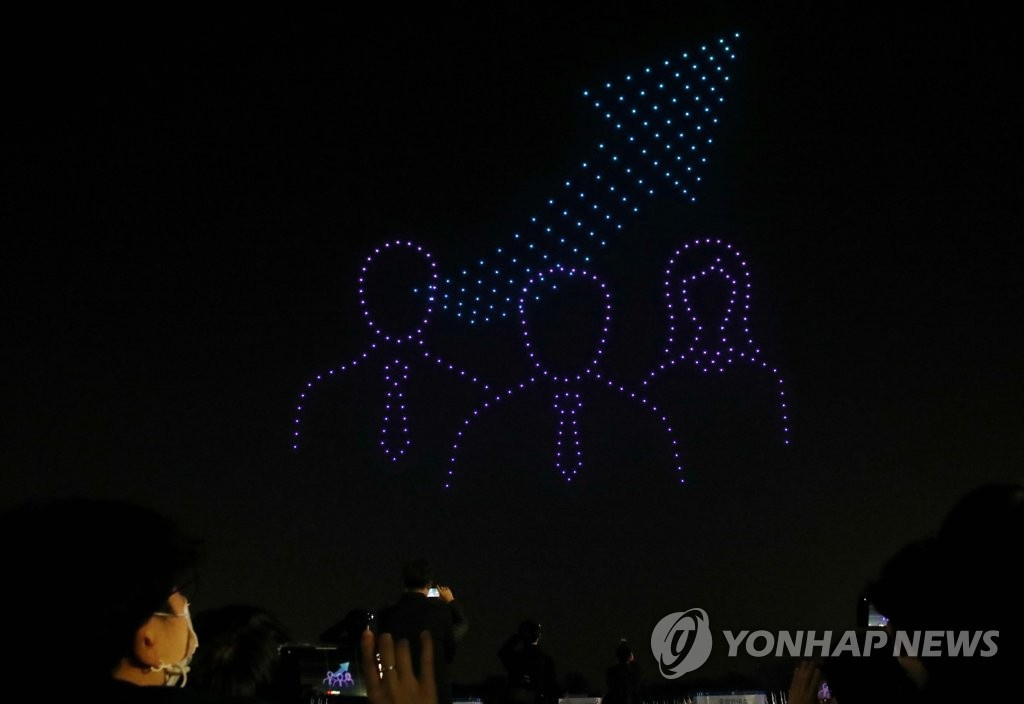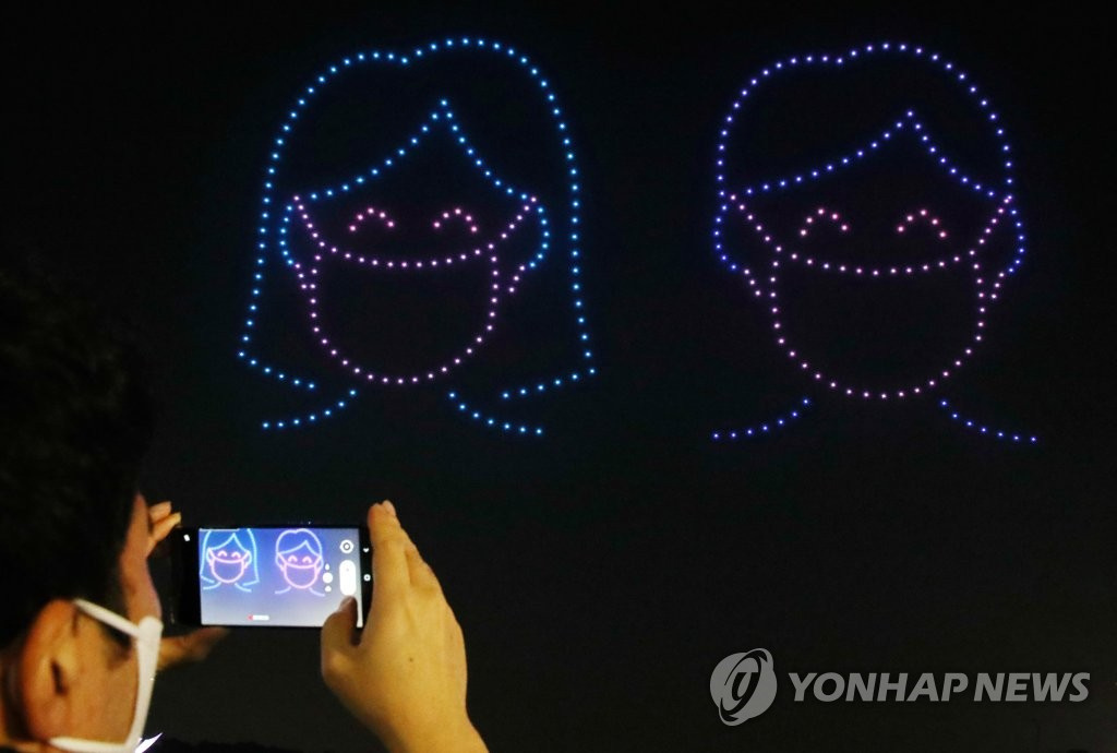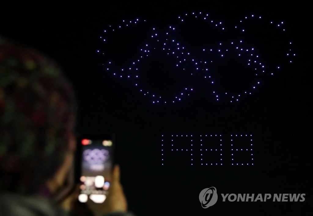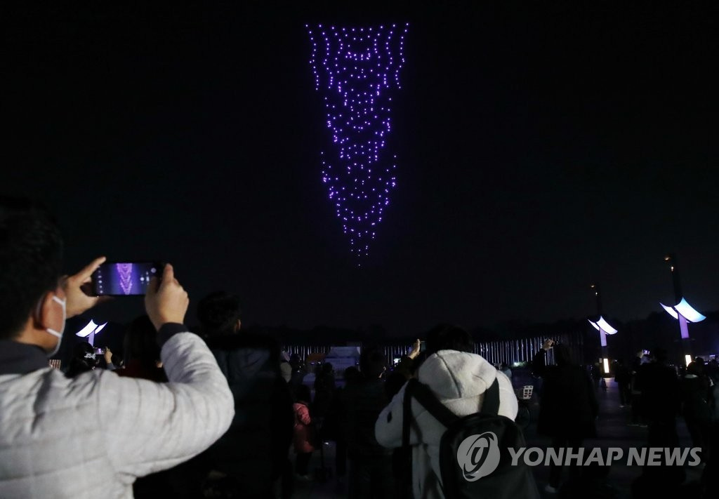 人民网讯 据韩联社报道,13日,首尔松坡区奥林匹克公园和平门上空举办一场别开生面的无人机表演秀,吸引大批市民前来观看。据悉,本次表演秀以“韩国版新政”为主题,韩国国土交通部出动了300多架无人机,场面十分壮观。与此同时,该活动旨在向抗击疫情的韩国民众传递温暖与力量。(编译:实习生 刘佳怡 图源:韩联社)