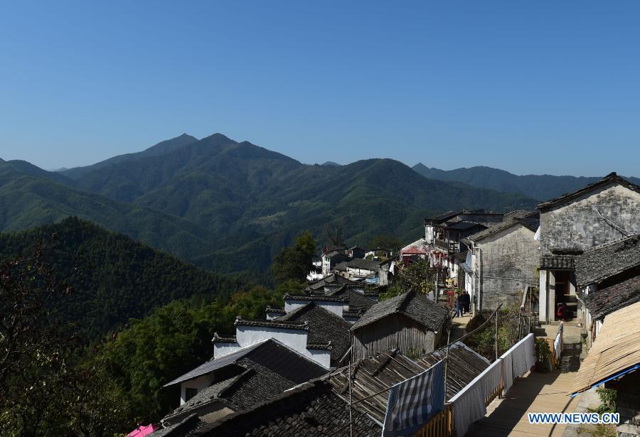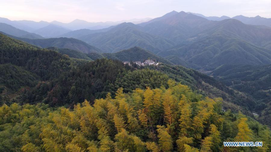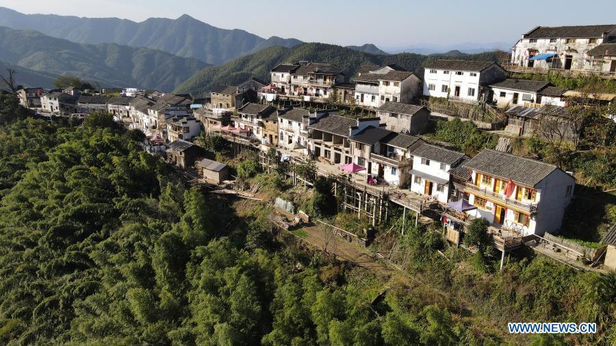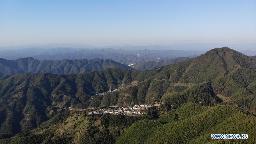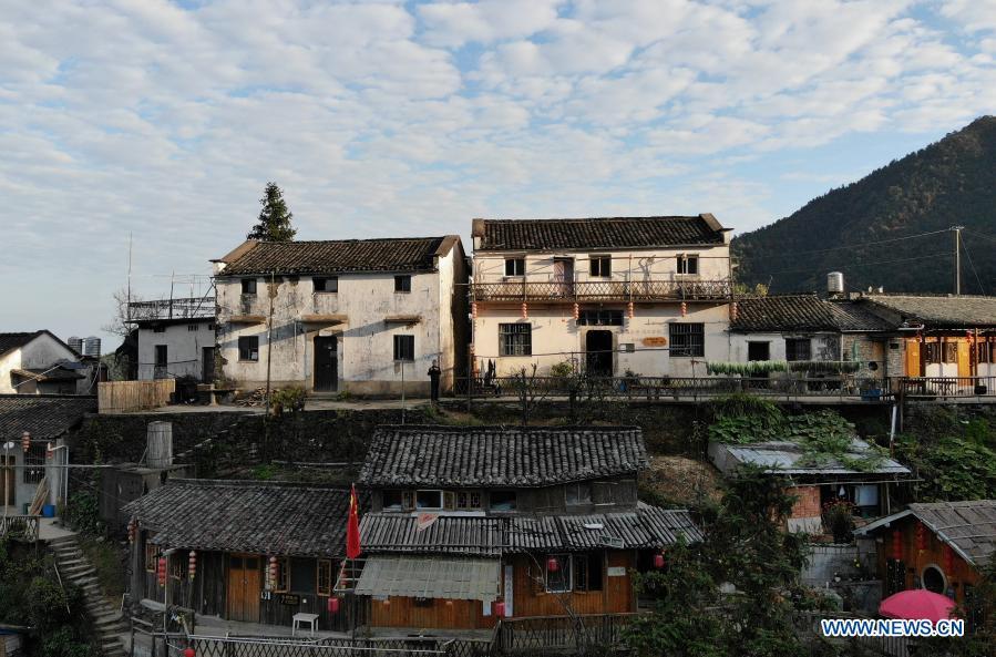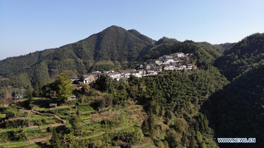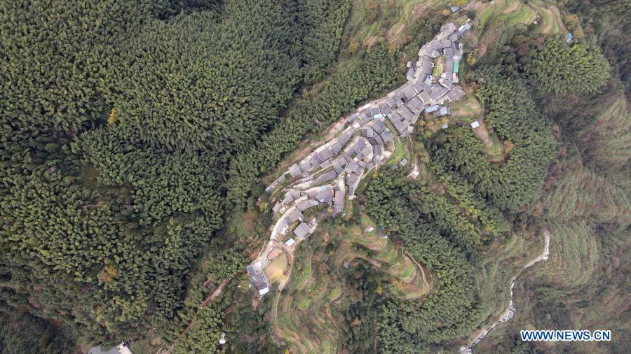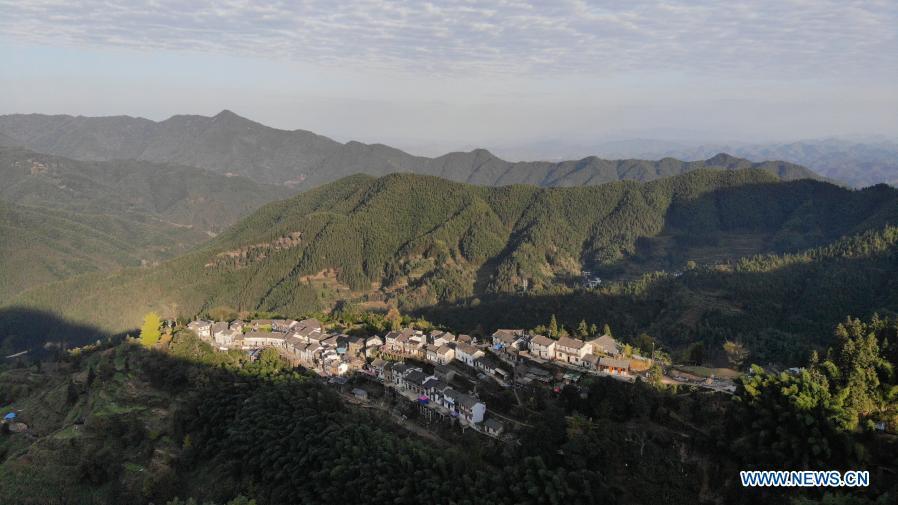 Aerial photo taken on Nov. 5, 2020 shows a view of Mulihong Village in Xikou Town of Xiuning County, east China's Anhui Province. Mulihong Village was built over 400 years ago in late Ming Dynasty. Located on a mountain ridge facing cliffs on three sides, it is known as "the hamlet on the cloud". (Xinhua/Huang Bohan)
