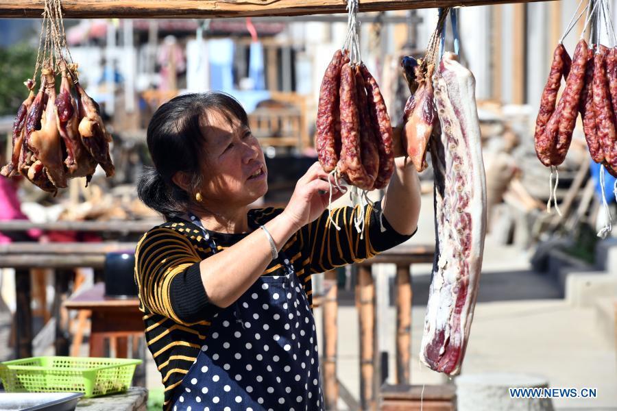 A villager hangs meat for drying as a method of preservation in Mulihong Village in Xikou Town of Xiuning County, east China's Anhui Province, Nov. 4, 2020. Mulihong Village was built over 400 years ago in late Ming Dynasty. Located on a mountain ridge facing cliffs on three sides, it is known as "the hamlet on the cloud". (Xinhua/Zhou Mu)