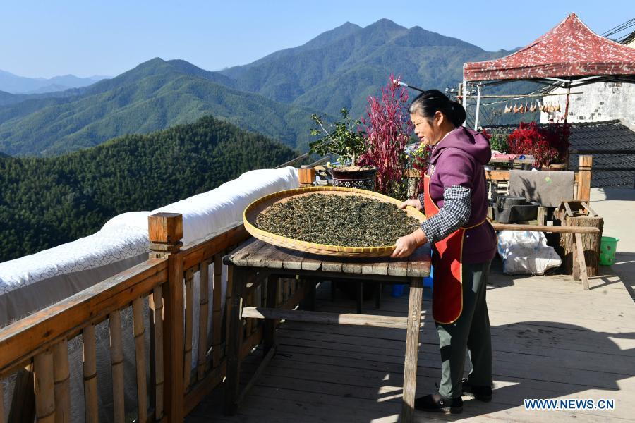 A villager dries food in Mulihong Village in Xikou Town of Xiuning County, east China's Anhui Province, Nov. 5, 2020. Mulihong Village was built over 400 years ago in late Ming Dynasty. Located on a mountain ridge facing cliffs on three sides, it is known as "the hamlet on the cloud". (Xinhua/Zhou Mu)