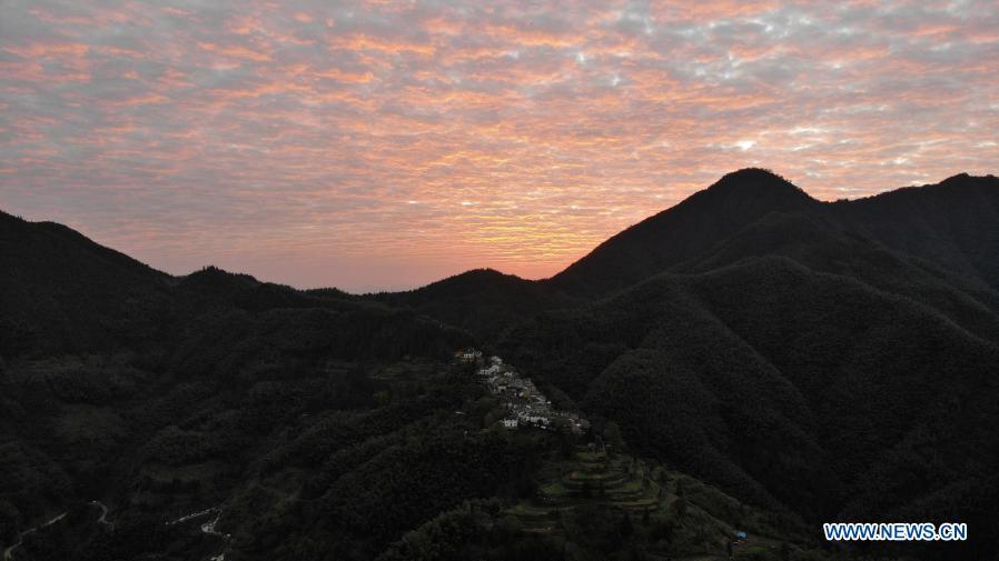 Aerial photo taken on Nov. 5, 2020 shows a view of Mulihong Village at dawn in Xikou Town of Xiuning County, east China's Anhui Province. Mulihong Village was built over 400 years ago in late Ming Dynasty. Located on a mountain ridge facing cliffs on three sides, it is known as "the hamlet on the cloud". (Xinhua/Huang Bohan)