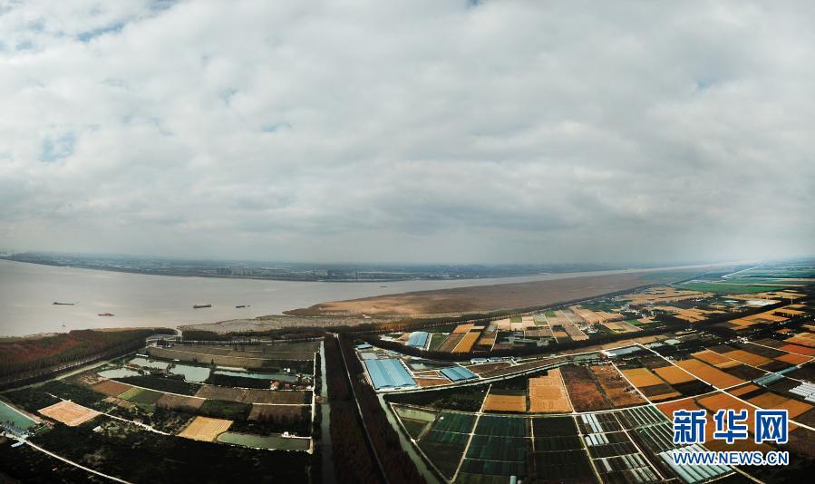 长江从崇明岛(前)和江苏省海门市之间流向大海(2019年11月28日摄,无人机照片)。新华社记者 方喆 摄