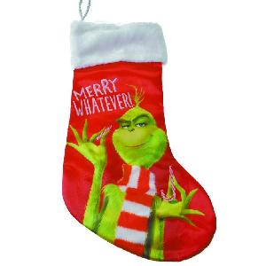 可以说,在英国和美国,格林奇是一个妥妥的圣诞大咖。每到圣诞节来临时,格林奇的形象就会出现在各种地方,被印在圣诞袜子上(如右图)、被贴在圣诞树挂件上、被制作成小摆件放在礼物精品店里。甚至还有商家推出格林奇版圣诞树——他穿着圣诞老人的衣服,用两只又尖又长的手环抱着圣诞树,好像时刻准备着要把圣诞树偷走。