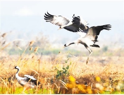 “快看,丹顶鹤求爱啦!”导游的一声吆喝,如乐队的指挥,将游客的目光齐刷刷吸引到一处。只见一只雄鹤嘴尖朝上,昂起头颈,仰向天空,双翅耸立,“呵,呵,呵”引吭高歌。旁边的一只雌鹤立马高声应和,然后彼此对鸣、跳跃和舞蹈。