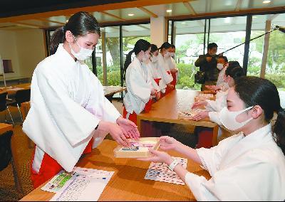 通过考试后,临时巫女需要进行岗前培训,掌握与神道教相关的知识、符合身份的礼仪和语言等。神社里的工作忌讳和规矩较多。比如,神社是神圣的地方,一般不能用打工这种说法,大多被称作“助勤”;贩卖神社的护身符等物品时,也不可用“出售”“贩卖”等词汇,要用“授予”。
