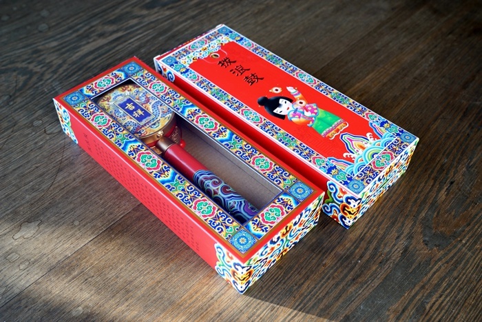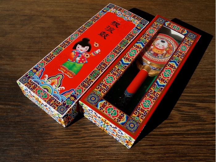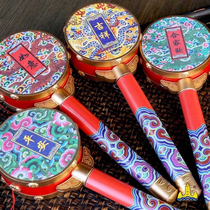 二是拨浪鼓。2008年奥运会开幕式的时候,每一位现场观众都会收到一个拨浪鼓,它代表北京文化传达出喜庆意蕴。普通拨浪鼓作为玩具,非常粗糙,也没有图案。我就想能不能从拨浪鼓这里拾起文化的链环?我在宋代苏汉臣的一幅画《五瑞图》里看到了宋代人玩的拨浪鼓,画作上几个孩子在做社火活动,摇着的拨浪鼓超级精致,非常漂亮。为什么到了现代给孩子玩的拨浪鼓这么粗糙了呢?孩子们一定不会喜欢!出于这种心理,我就把能体现皇家文化的纹样用在了拨浪鼓上,包括它的底托、鼓柄和鼓腔,做得金碧辉煌。这就使得古老的拨浪鼓焕发出了新面貌,也充分体现了传统文化。