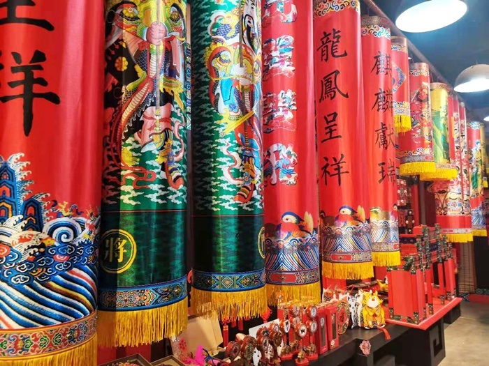 一是丝绸灯笼。中国灯笼都是带龙骨的,就是由硬龙骨把灯笼撑开,因为旅游产品要便于携带,所以我们一直在研究怎么才能实现便于携带,怎么能让灯笼打开时很大缩起来又很小?后来我们就借用了古代皇家仪仗中用的“幢”,就是一个大的、软体的、丝织的、柱形的仪仗用品。它里面点上灯,就像灯笼一样,因为没有龙骨只借重力就能打开,就很容易收纳,体积很小。这种灯笼还有一个特点,就是可以随意的添加图案。中国传统文化的特点之一就是“图必有意义,意必吉祥”,在北京传统文化里,宫灯就具备这样的特点,上面都有图案,有绘画,讲述很多传统故事。我们就把这样的形式作为我们产品的基本元素,申报了国家专利,市场接受度也非常好。