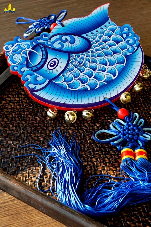 社火壁挂的专利点在于它的图案和扁平化,因为原来的社火是马勺的样子。现在做成了一个木质的板状挂件,加上了藏传佛教的五色丝结,又挂了铜响铃。响铃也叫醒铃,就是惊醒的意思。其间也蕴含着一些良好的心理暗示和寄托。