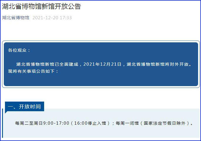 中工网讯 据“湖北省博物馆”微信公众号消息,近日,湖北省博物馆发布新馆开放公告称,湖北省博物馆新馆已全面建成,2021年12月21日,湖北省博物馆新馆对外开放。
