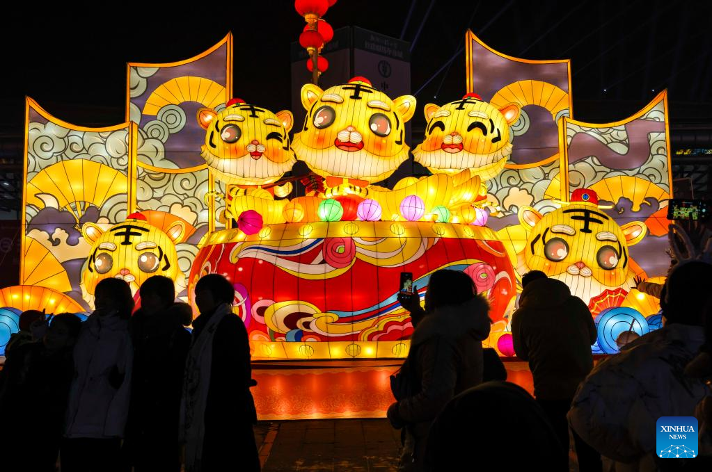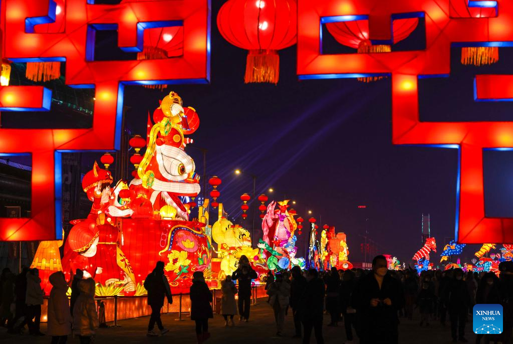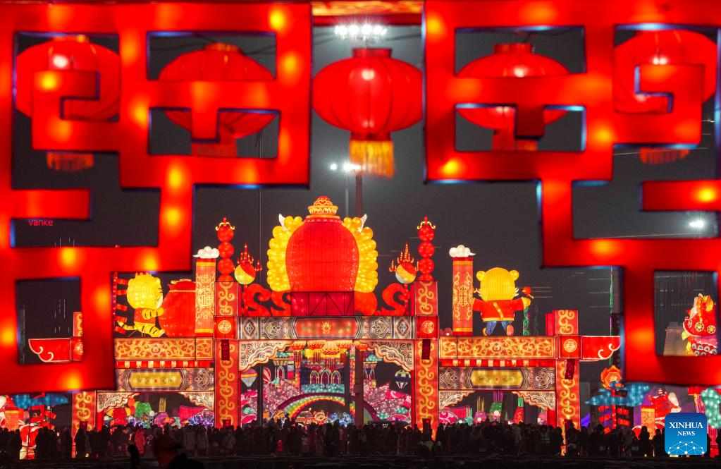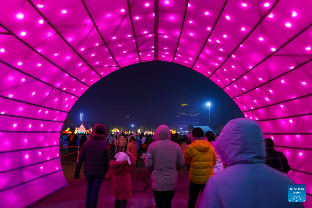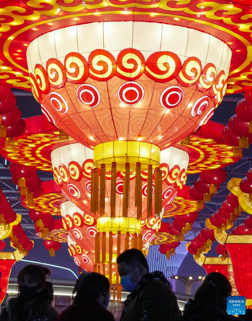 People visit a lantern show at the Xinjiang International Convention and Exhibition Center in Urumqi, northwest China's Xinjiang Uygur Autonomous Region, Jan. 1, 2022. (Xinhua/Hu Huhu)