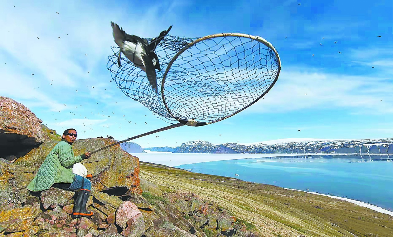 每年夏天,格陵兰岛都会迎来一大波来此交配产卵的候鸟,其中数量最大的就是多达数千万只的海雀。此时,因纽特人会全家老幼出动,挥着网捉海雀。各家的男人则会捕猎海豹,把海豹皮尽量完整地剥下来,而且必须要带着厚厚的皮下油脂。人们把捕获的海雀不做任何处理带着羽毛塞到海豹皮中,尽量塞满,务求不留一丝空隙。根据海豹的大小,一般一张海豹皮中可以塞300到500只海雀,塞满后人还要站上去使劲踩,把里面的空气都挤出来,再用针线把海豹皮的开口缝死,最后在缝合处还要抹上厚厚一层海豹油密封。之后就用大石块把它埋起来,剩下的就交给时间了。到了9月份,海雀就要离开格陵兰岛飞往南方过冬了,所以这些准备工作一定要在9月底前完成。