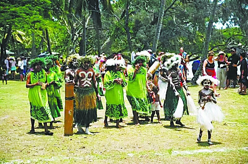 新喀里多尼亚的土著保持着原始的生活状态。美拉尼西亚人是新喀里多尼亚的土著,他们也被称为卡纳克人,数量上占全国总人口的四成多。新喀里多尼亚的人口构成还包括30%多的欧洲移民,主要来自法国。其他还有来自澳洲和亚洲等地的移民。该国最主要的岛屿为格朗德特尔岛,占总领土面积的大半。作为土著的卡纳克人则主要聚居在洛亚蒂群岛或称忠诚群岛上。卡纳克人有数百个部族,大多保持着刀耕火种和渔猎等相对原始的生活状态,这与当地数百年的殖民统治不无关系。卡纳克人的所有财产都是归部落宗族公有的,这一点早期对殖民者侵占部落的土地和资产很有利,因为他们只需要做通酋长一个人的工作就可以了。对于卡纳克人来说,他们如果想拥有私有财产就必须在保护区之外购买,但落后的经济状况限制了他们的收入,这让他们很难迈出保护区。所以在外国游客常到的首府努美阿等地,除了少数从事部落文化表演的卡纳克人,很少看到原住民。卡纳克人的传统舞蹈来源于生活(如图),简单而整齐的动作再现了耕种以及收获的场景,伴奏也很古朴,就是用短木棍敲击掏空的木头和椰子。