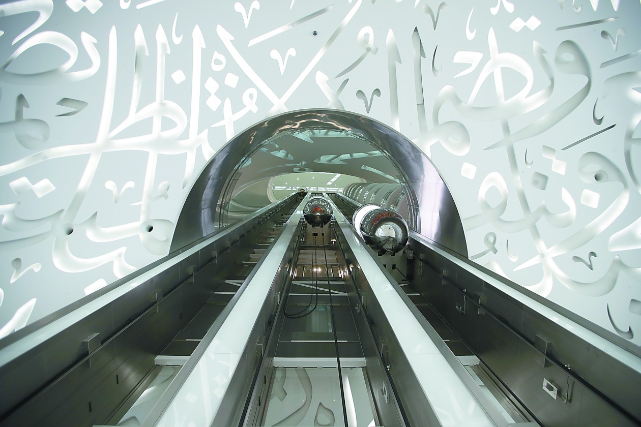 步入博物馆大厅,扑面而来也是满满的未来感。馆内共分为7层,没用一根柱子支撑,墙面与外墙呼应,也是由镂空感的阿拉伯书法作为装饰。机器海豚、水母和鳐鱼在大厅中飞来飞去,让人误以为来到了海底世界。其实,这些都是仿生机器人。观众可以乘坐犹如时空穿梭机一般的观光电梯在各层之间穿梭(下图),电梯旁也有螺旋状的步梯。