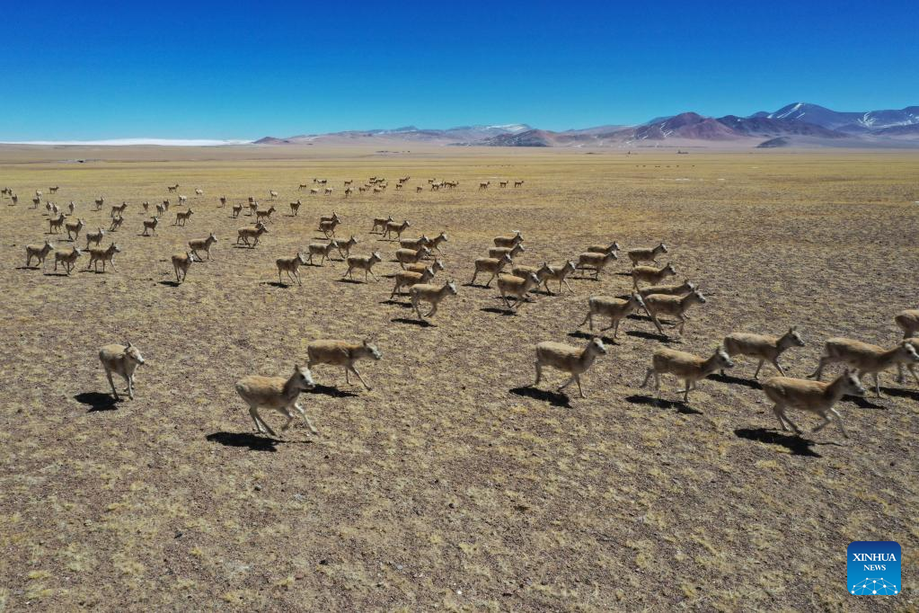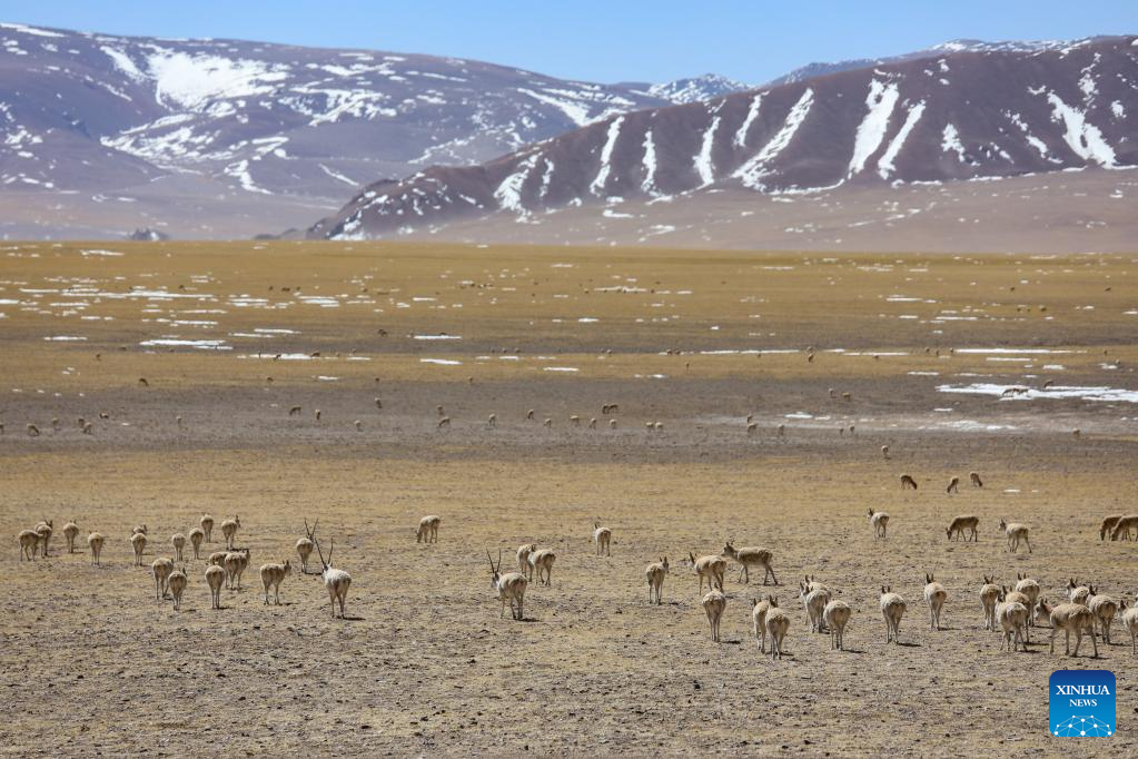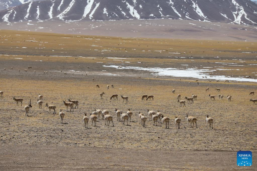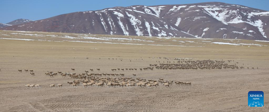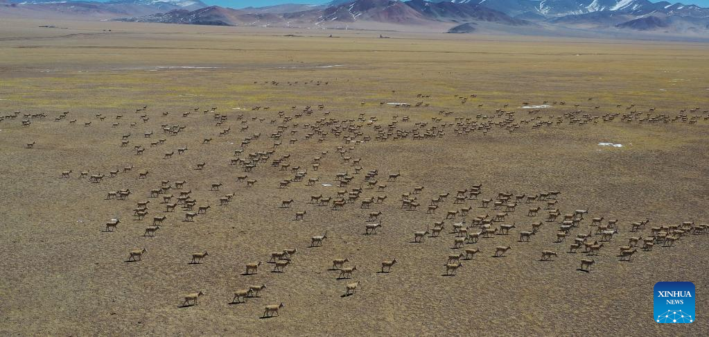 Photo taken on March 27, 2022 shows a number of Tibetan antelopes in Gerze County of Ali Prefecture, southwest China's Tibet Autonomous Region. Nearly 10,000 Tibetan antelopes gathered in Gerze County, a rare occurrence believed to be related to the improvement of the biodiversity and protection endeavors. (Photo by Penba/Xinhua)