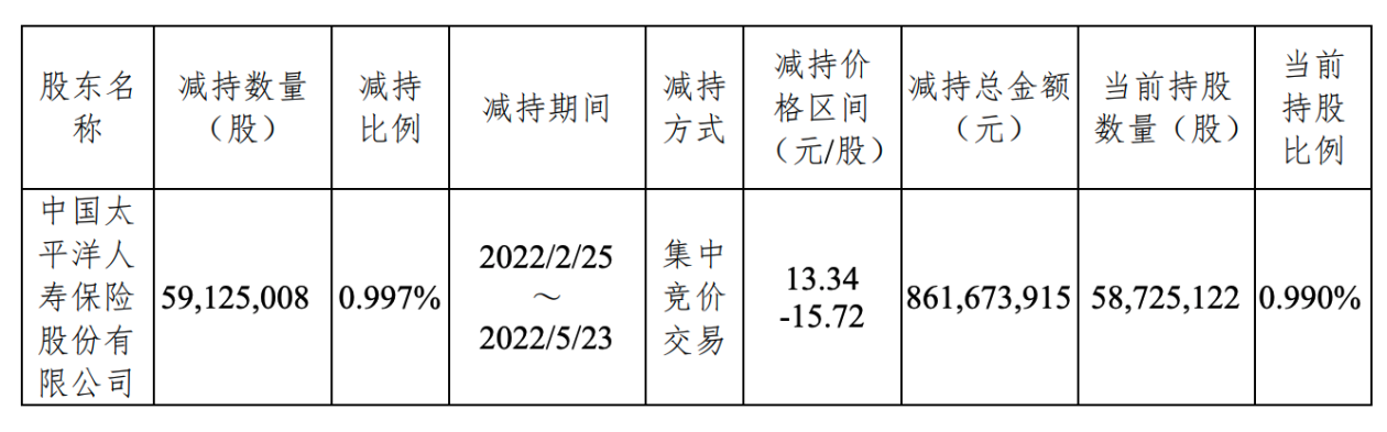据公告,自2月25日起至5月23日下午收盘,太平洋人寿已通过集中竞价方式累计减持公司股份5912.5万股,占公司普通股总股本的0.997%。