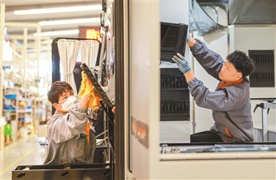 在山东省荣成市一家房车制造企业的生产车间内,工人们开足马力赶制房车订单。李信君摄(人民图片)