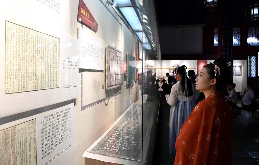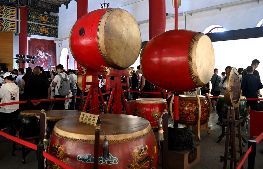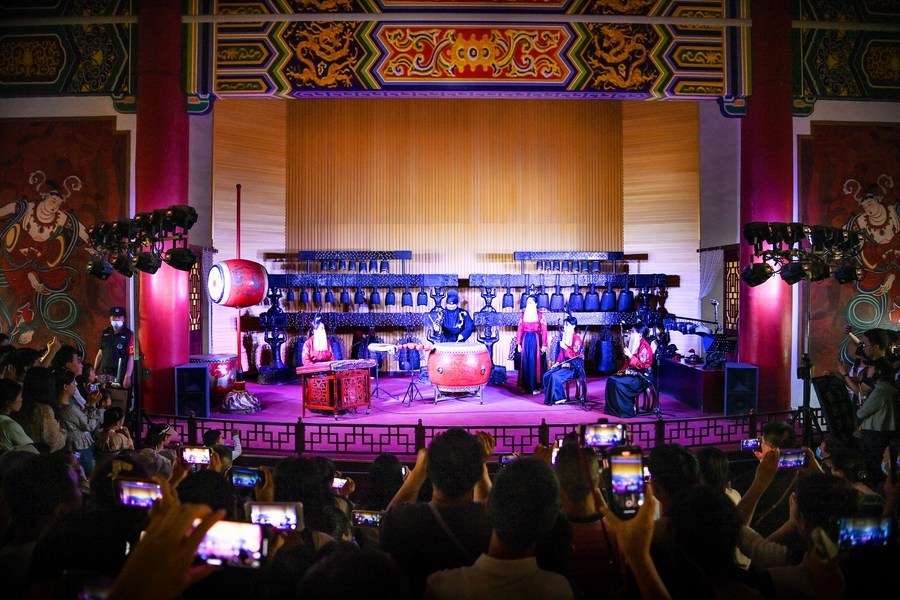 Tourists watch a performance at the Drum Tower in Xi'an, northwest China's Shaanxi Province, May 1, 2023.(Photo by Zou Jingyi/Xinhua)