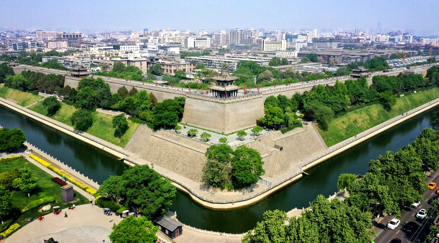 This aerial photo taken on April 15, 2023 shows a view of the southwest corner of the ancient city wall in Xi'an, northwest China's Shaanxi Province.(Xinhua/Liu Xiao)
