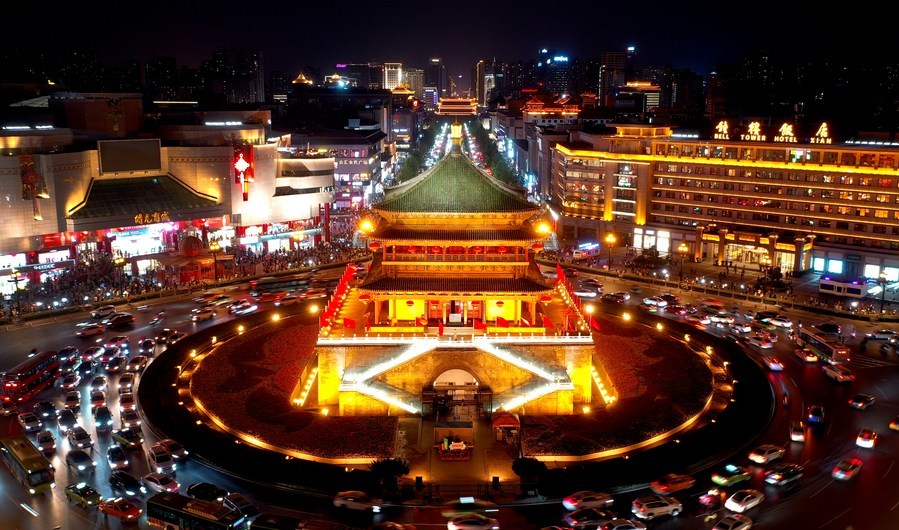 This aerial photo taken on May 2, 2023 shows a night view of the Bell Tower in Xi'an, northwest China's Shaanxi Province.(Xinhua/Liu Xiao)