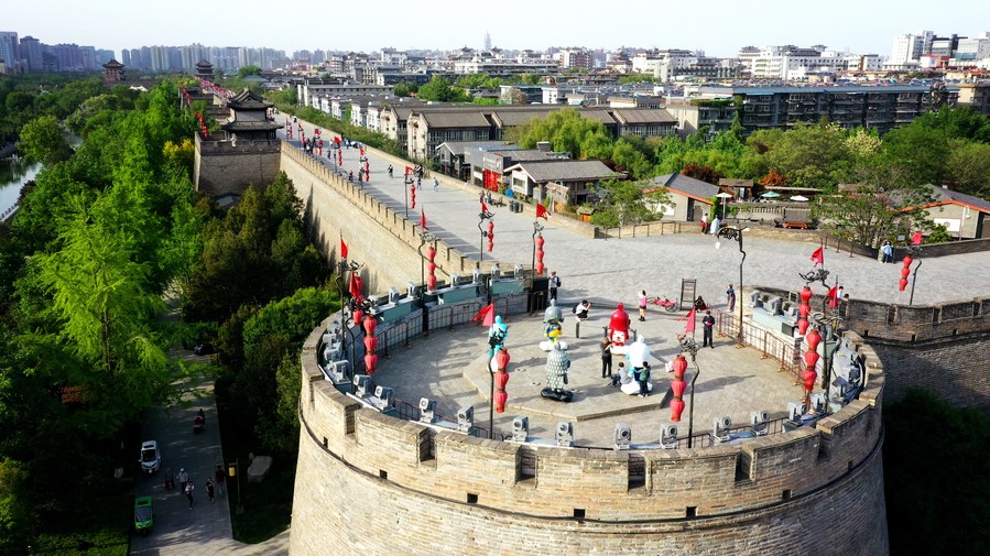 This aerial photo taken on April 30, 2023 shows tourists visiting the ancient city wall scenic spot in Xi'an, northwest China's Shaanxi Province.(Xinhua/Liu Xiao)