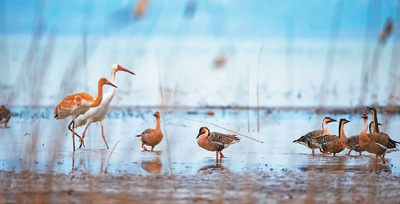 初夏,晨光洒在波光粼粼的湖面,平静的网湖热闹了起来。形态各异的水鸟、珍禽,有的在滩涂上悠闲觅食,有的成群结队振翅高飞。