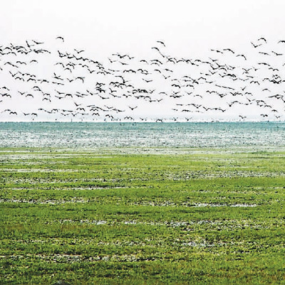 顺着他手指的方向,只见大大小小的滩涂上,有黑点和白点在移动。通过望远镜一看,竟是一群群水鸟。水草在清澈的湖中摇曳,有的已经高出了水面。