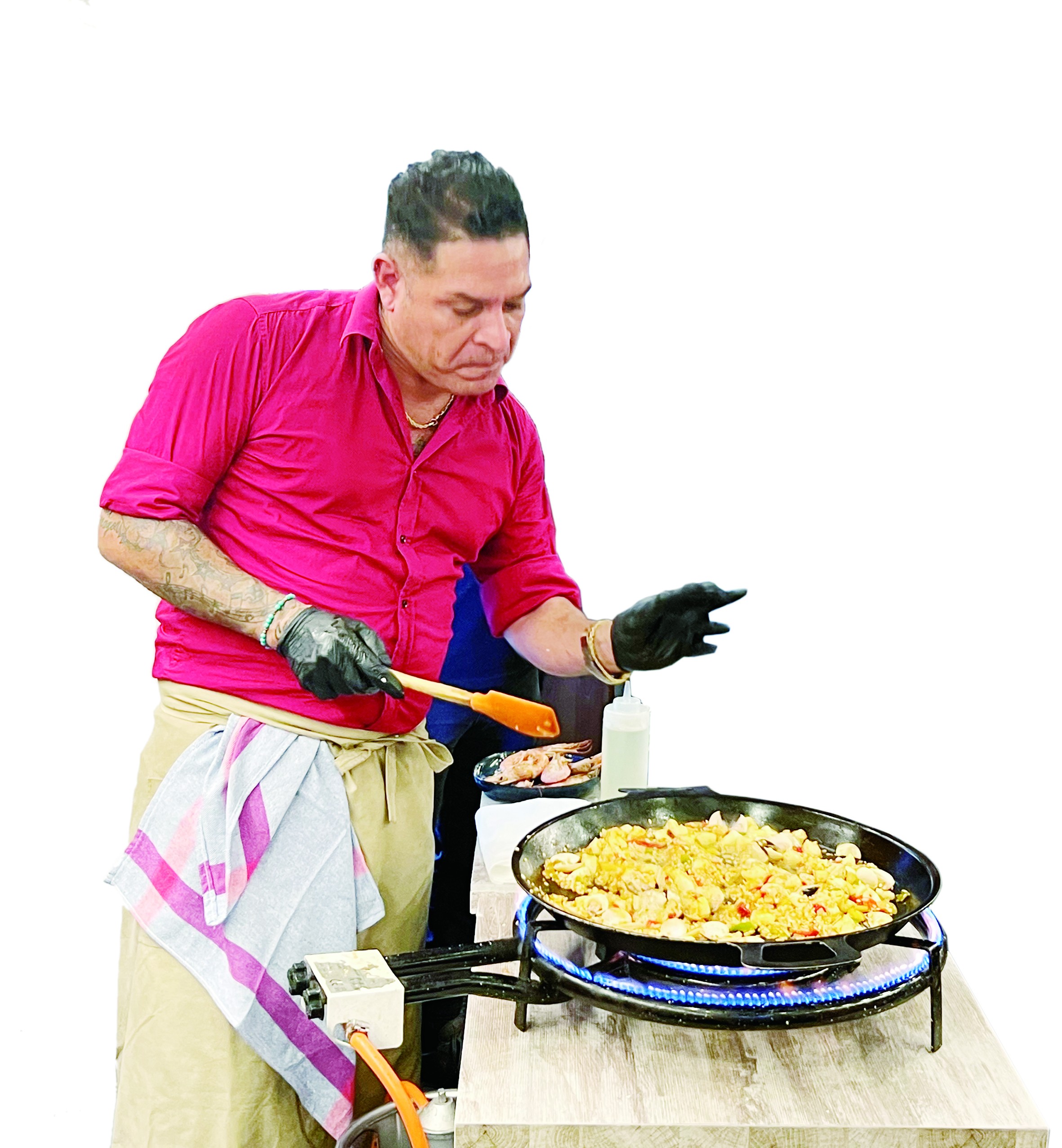 做海鲜饭的厨师年纪并不大,走到桌前和我们打过招呼后,便系上围裙,开始在餐厅放的一张特质餐台上起锅做饭。桌上放着一个灶台,旁边有一个小型煤气罐,各种海鲜和西红柿、辣椒等食材已经分门别类装到盘中备用。客人们围了过来,目不转睛地看着厨师,希望能探究西班牙海鲜饭的制作秘诀。