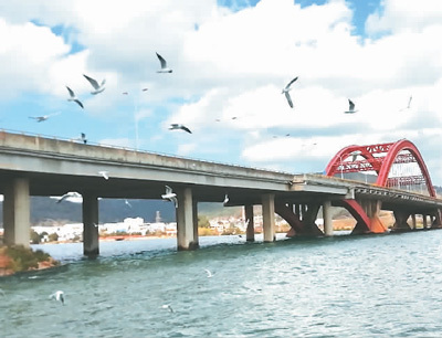 红嘴鸥在昆明滇池海口特大桥附近飞翔。