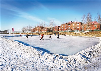 冰球爱好者在雁溪湖生态景观公园玩冰球。李 博摄