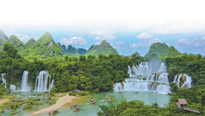 两岸瀑布挂青山,气势磅礴,闻声数里。去年9月15日,作为中国首个跨境旅游合作区,中越德天(板约)瀑布跨境旅游合作区(以下简称“合作区”)启动为期一年的试运营。该项目由中国广西壮族自治区与越南高平省共同建设和实施。试运营期间,两国游客可持合法有效证件,经边检部门检查后,到合作区对方一侧参观游览。越南青年阮明和与友人到高平省旅游,看到跨境旅游项目手续办理流程十分方便就报名参团。“在德天瀑布,我们参观了壮锦大道、观瀑平台、三级瀑布等景点。中国景区投资力度大,各项基础设施建设完善,服务质量也很高。”阮明和说。