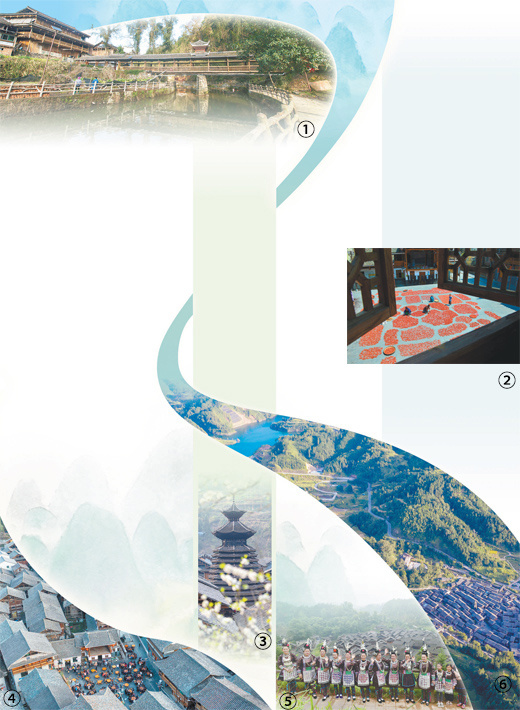 图①:增冲村的吊脚木楼和寨脚风雨桥。吴德军摄(人民视觉)