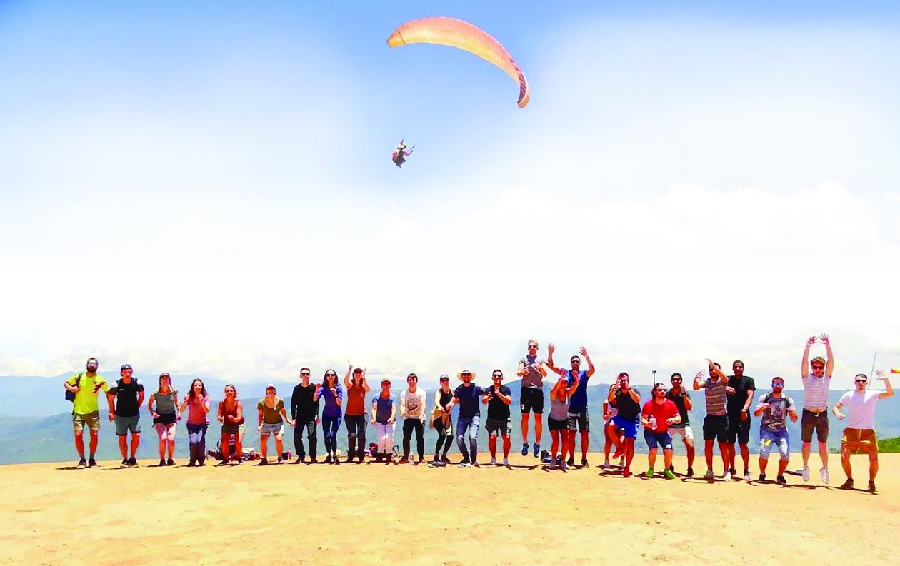 和其他飞友一起听完教练的飞行安全简介以及起飞、滑翔和着陆的指导后,笔者穿上滑翔服、系好安全带等待起飞。前方同伴一个个跑向悬崖边,跳出去,声嘶力竭地大喊,很快声音从恐惧变得兴奋。终于轮到笔者,一二三,跑!用尽全力冲向悬崖,脚离开地面的那一刻,身后的滑翔伞快速飘起,体感轻盈。虽然第一次飞滑翔伞,但笔者居然只有兴奋没有恐惧,因为教练就在身后保驾护航,大可安安心心地享受美景。